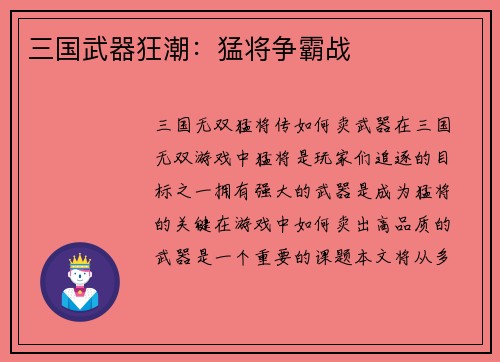 三国无双猛将传如何卖武器 在三国无双游戏中,猛将是玩家们追逐的目标之一。拥有强大的武器是成为猛将的关键。在游戏中,如何卖出高品质的武器是一个重要的课题。本文将从多个方面详细阐述如何卖出高品质的武器,帮助玩家们在游戏中取得更大的胜利。 1. 武器的属性和品质 武器的属性和品质是玩家们选择购买的重要因素...